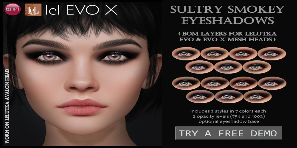 ~ Izzie's ~ BOM Sultry Smokey Eyeshadows Black A 100% (for LeLutka Evo and Evo X mesh heads: eyeshadows in 2 styles, 7 colors each in 2 opacity levels (75% and 100%); optional eyeshadow base either to be worn under or over the eyeshadow (whatever look you prefer) to intensify the result) TP to IZZIEs MAINSTORE