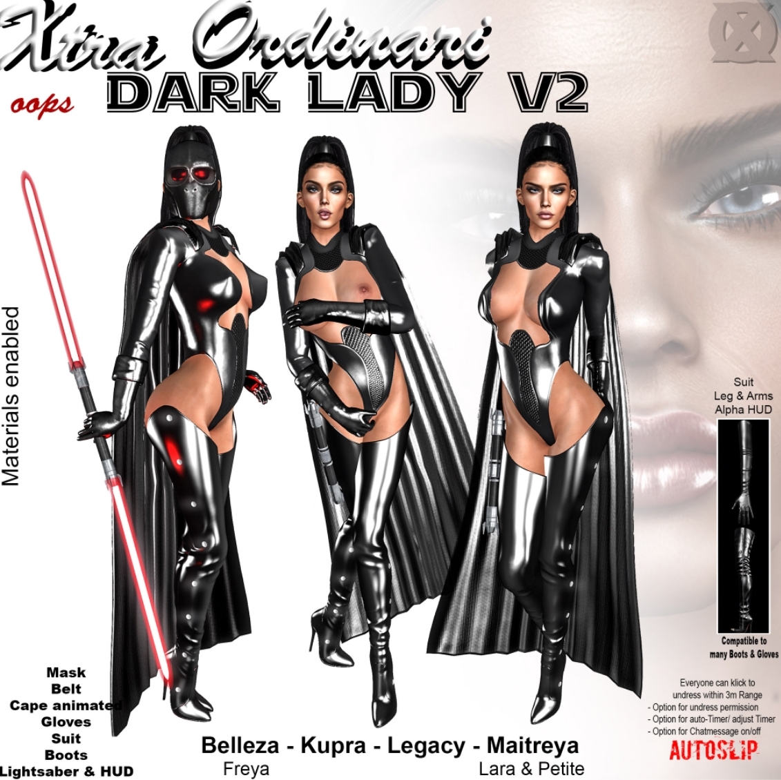 ~ XO ~ OOPs undress DARK-LADY V2 Outfit (Rigged for Maitreya, MPetite, Legacy, Kupra, Freya / Materials enabled, comes with combat, lightsaber and cape animation HUD) TP to SUPERHERO, CHEESEBURGER SIM